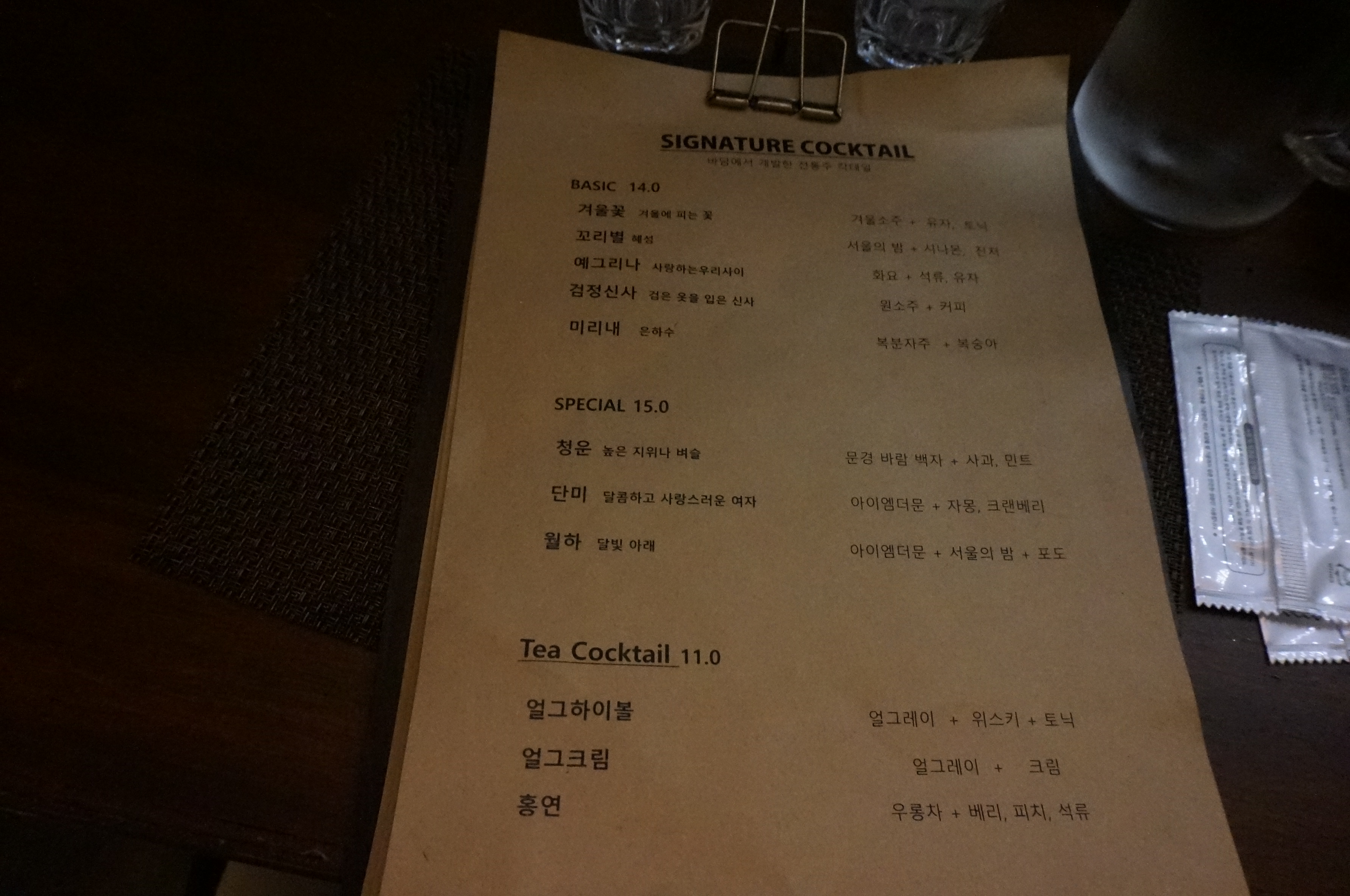 메뉴판 첫장은 바담에서 개발한 바담 시그니쳐칵테일이에요. 다른데서는 없는 전통주로 만든 칵테일이여서인지 더 맛있어요.다른데서는 먹지 못함 전통주고 만든 칵테일이니 꼭 마셔보세요. 바담을 방문하게된다면 시그니쳐 칵테일은 꼭 필수