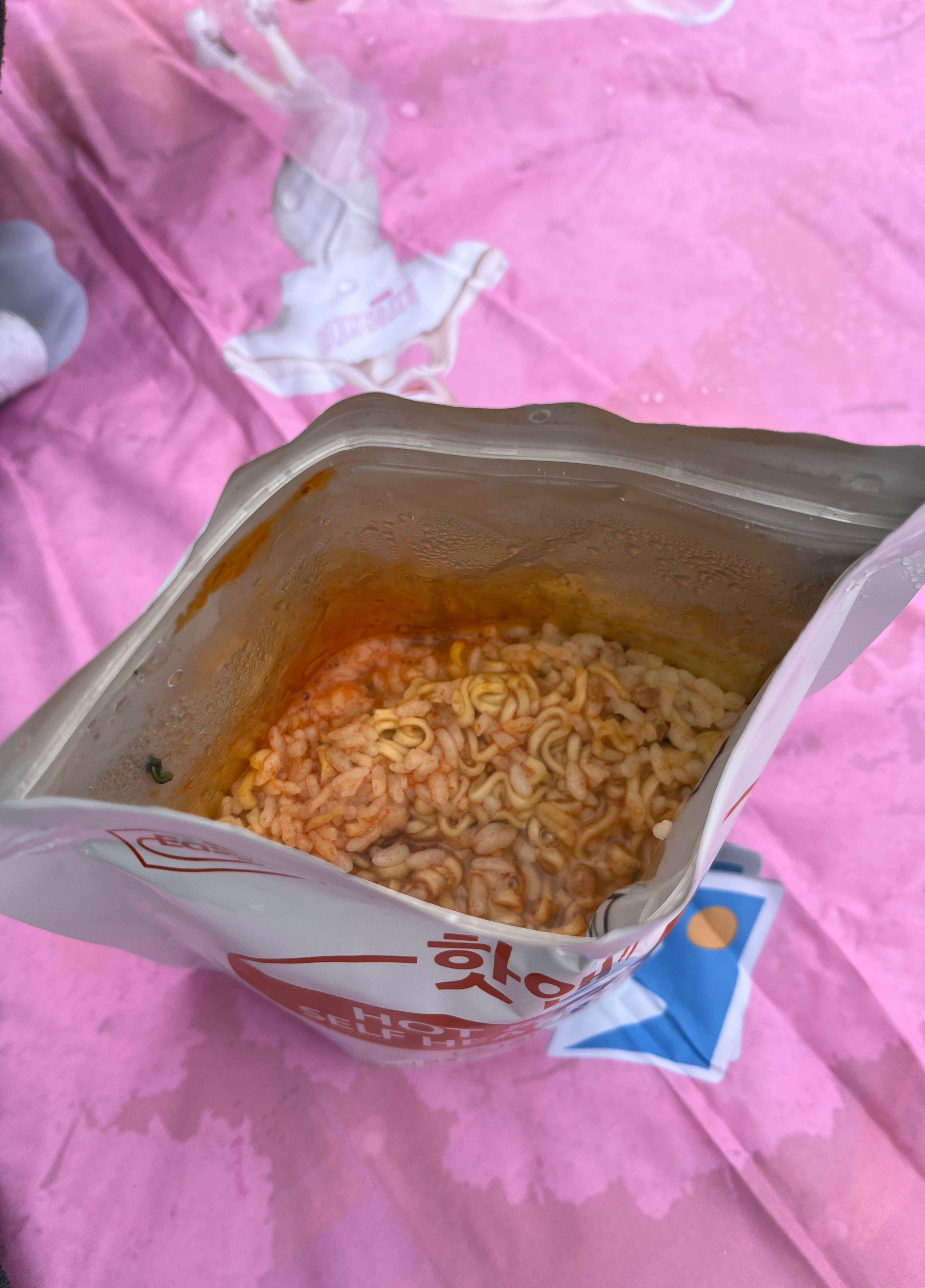 물넣자마자 끓기 시작하는 핫앤쿡라면애밥. 소리가 터질거같지만 외포장지에 구멍이 뚫린이유가 있더라구요ㅋㅋㅋ하지만 소리가 너무 크게나서 소리집중.. 지나가는 어른들마다 뭐냐고 물어보셨어요ㅎㅎㅎ